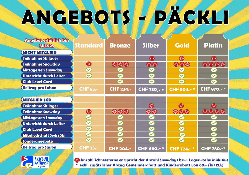 Der Skiclub Rothrist bietet 4 verschiedene Angebots-Päckli an. Standard entspricht dem Einzelpreis pro Anlass. In einem Snowday inbegriffen sind die Carfahrt, das Skibillett, das Mittagessen und der Unterricht von ausgebildeten J&S-Leitern. Dies ist unabhängig vom jeweiligen Angebots-Päckli